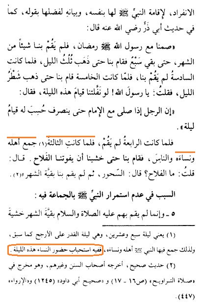 "يعني ليلةَ سبْعِ وعشرين، وهي ليلةُ القدر على الأرجحِ كما سبق، ولذٰلك جَمَعَ فيها النبيُّ صَلَّى اللهُ عَلَيْهِ وَسَلَّمَ أهلَه ونساءه، ففيه استحبابُ حضورِ النساءِ هٰذه الليلةَ" اﻫ مِن "قيام رمضان" (ص20، ط 7، 1417ﻫ، المكتبة الإسلامية).
